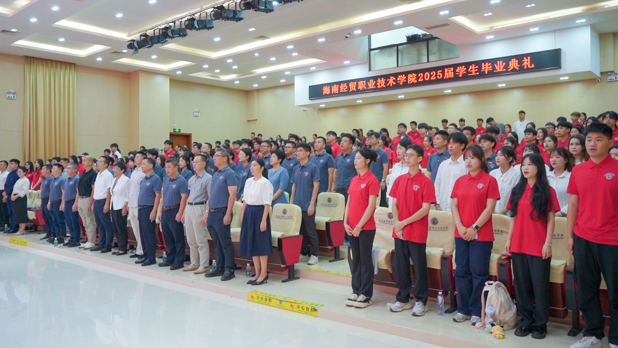 在庄严的国歌声中,毕业典礼正式拉开帷幕。激昂的旋律振奋鼓舞着现场每一位即将踏上新征程的毕业生们,大家眼中满怀对未来的憧憬,心中亦涌起无畏的勇气。